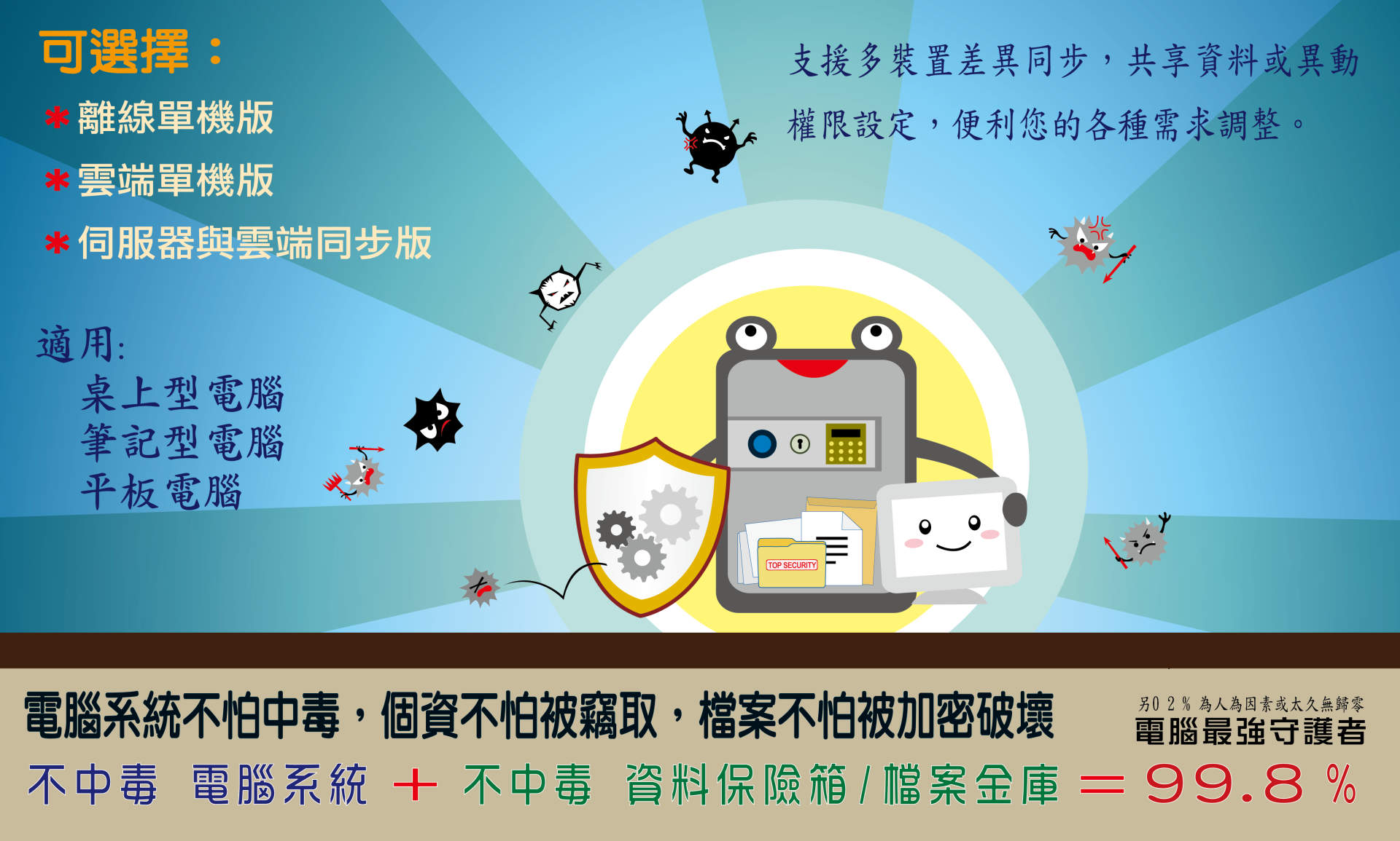 永金 不中毒-資料保險箱 / 檔案金庫,提供最安全的資料存取空間,擁有最強的資料保護能力及最快的資料搜尋速度。不僅能提升電腦原本的運算性能,還可以給予您最安全的工作環境。